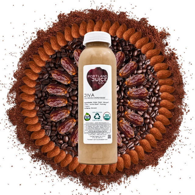 The Jiva Cold-Pressed Juice is a nutrient-packed blend made with cold-brewed coffee, vanilla bean, raw almonds, dates, nutmeg, and filtered water. It was made to support your overall health—boosting immunity, improving liver function, promoting heart health, and helping to keep you full and energized throughout the day.