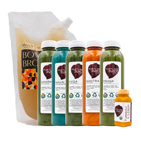 The Classic Cleanse Broth Box contains Lizzy's Organics chicken bone broth or vegan shiitake broth along with our carefully selected juices: Kasa, Navai, Prana, Mantra, Dharma, and a Turmeric wellness shot. The cleanse is offered as a three or six day cleanse. When you receive your three day Classic Cleanse, you will receive three of each juices and one 32oz pouch of broth. The broth comes to about 11oz per day, but feel free to do more or less depending on your body's needs.