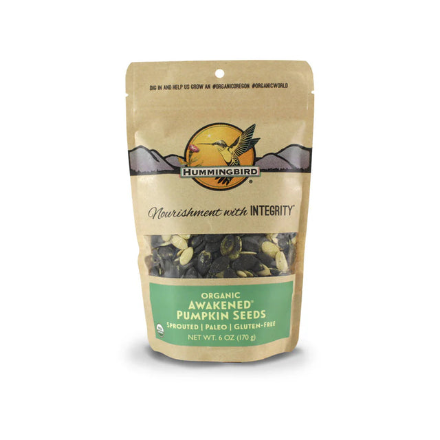 Nourishment with integrity! Awakened® Pumpkin Seeds are raw, Organic pumpkin seeds, grown in Oregon, soaked overnight in pure water, which initiates germination and helps reduce enzyme inhibitors that make raw seeds hard to digest. After soaking, seeds are rinsed in a very mild salt bath, using non-iodized Celtic Sea Salt®, and dehydrated at a low temperature until they reach the perfect crunchiness. Both soaking and the salt bath enhance the flavor of the raw pumpkin seeds, and dehydrating greatly increases their shelf life. Hummingbird has been working with Oregon farmers for many years to bring this unique crop to our area. These raw Organic Pumpkin Seeds grown in Oregon are dark green and have a fresh, slightly nutty flavor. This specialized hulless seed is the Styrian variety. Styria is located in Austria and is world-renowned for its excellent seed. Enjoy these Organic Raw Awakened® Pumpkin Seeds whenever you want a delicious, nutritious snack abounding with all the virtues of a good seed: protein, vitamin E, antioxidants, magnesium, copper, zinc and more!