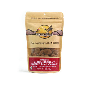 Hummingbird Exclusive—We make them in small batches right here in Eugene, Oregon. Organic Bing Cherries are packed with Vitamin C, Potassium and Antioxidants. Made with Fair Trade, Organic, Dark Chocolate that does not contain soy lecithin or dairy ingredients.